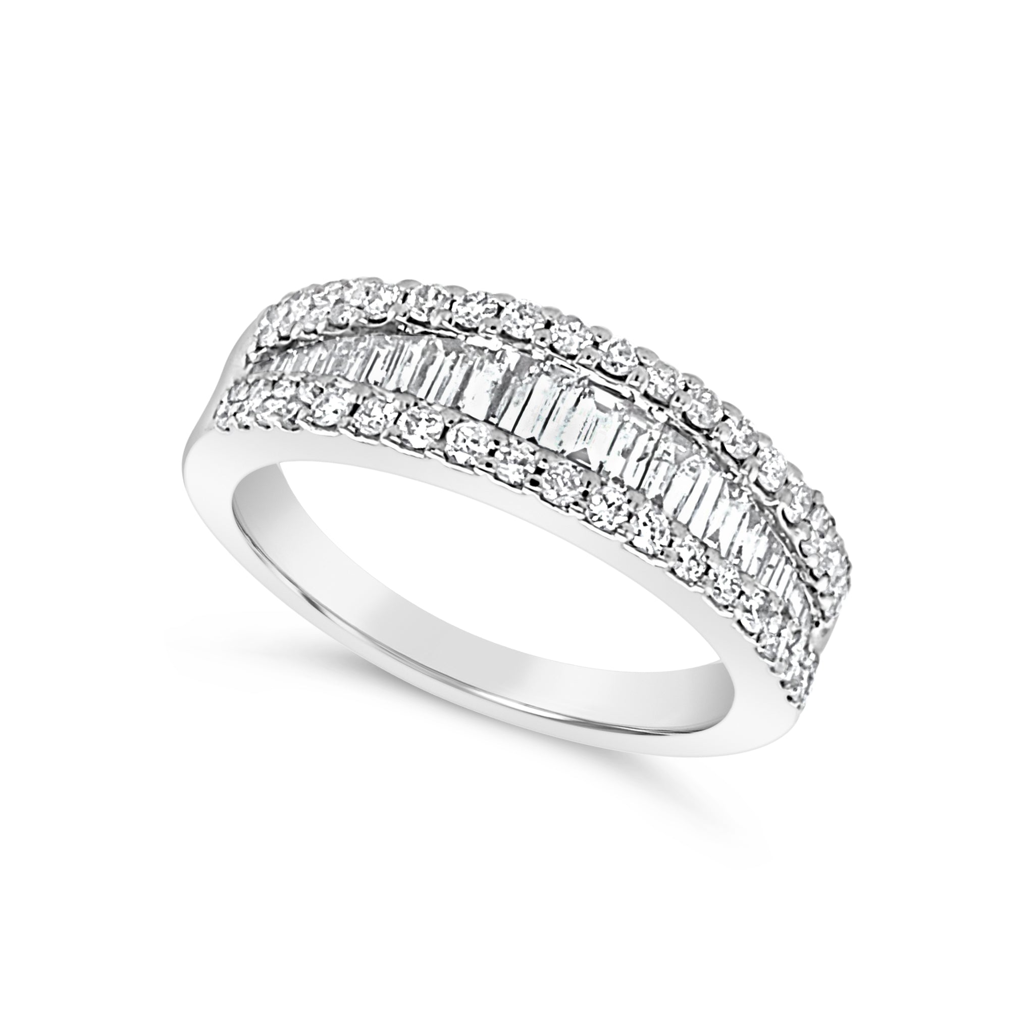 14kt white gold ring featuring a baguette diamond center row and round diamond outer row tapered design