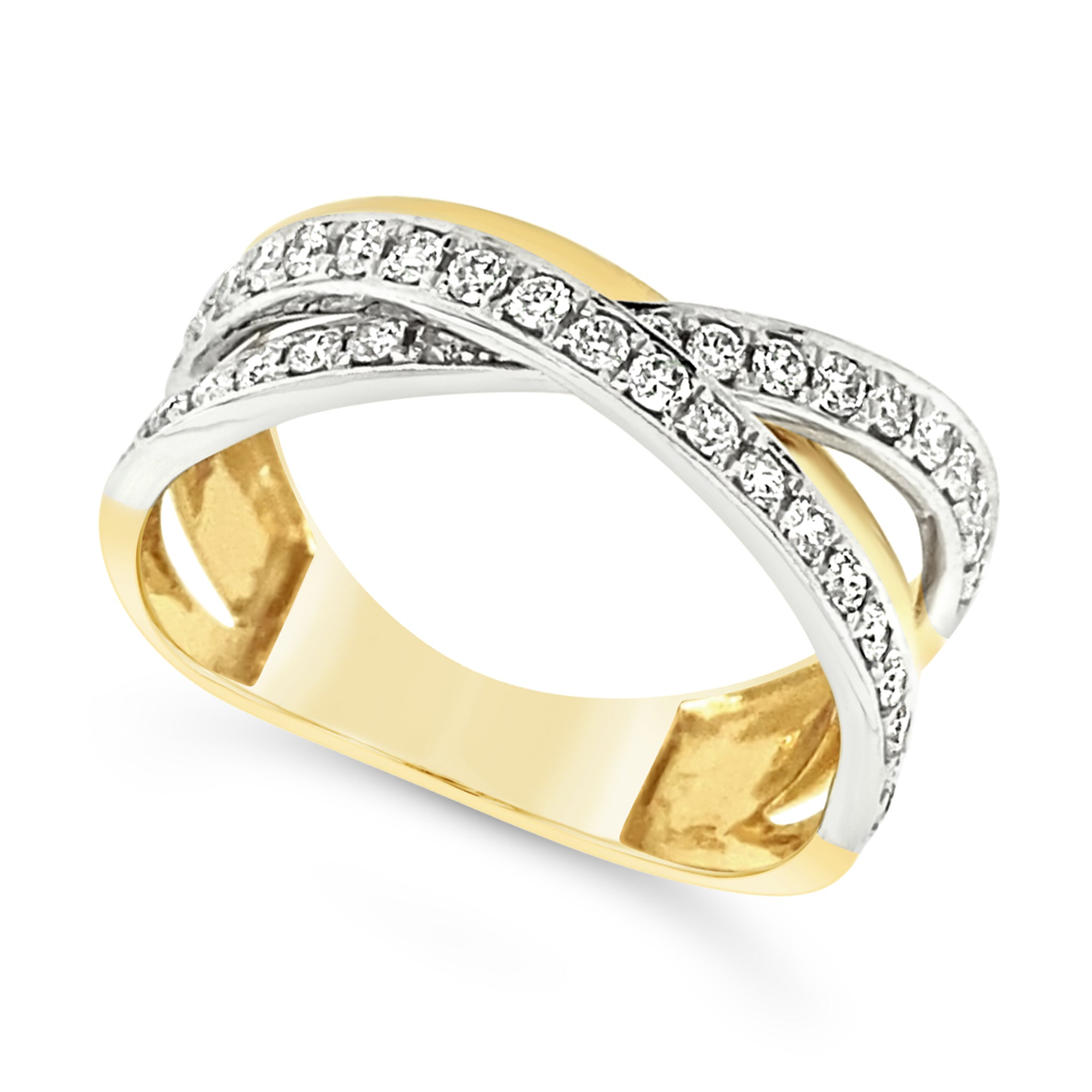 14kt two-tone gold ring featuring two diamond rows and one polished gold row in a crossover design